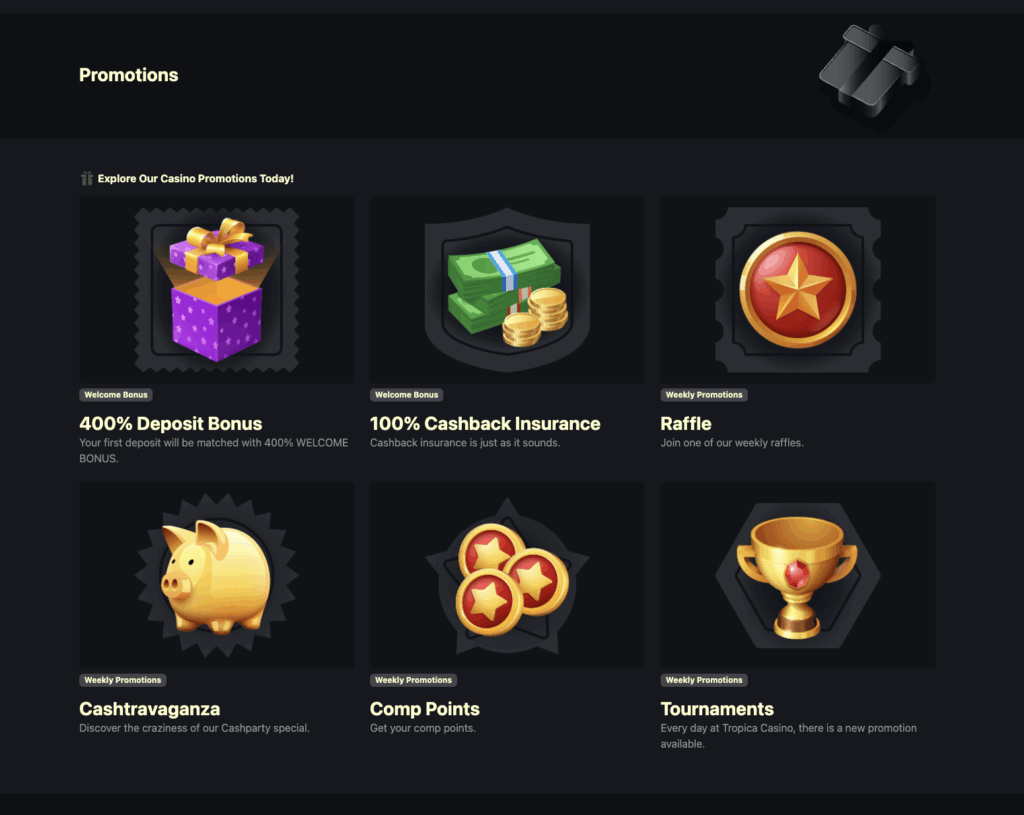 Tropica Casino delivers solid gaming experience for australian players. The combination of huge game selection, fast withdrawals and attractive bonuses makes it worth considering. Curacao license provides basic oversight while SSL encryption keeps your data safe.