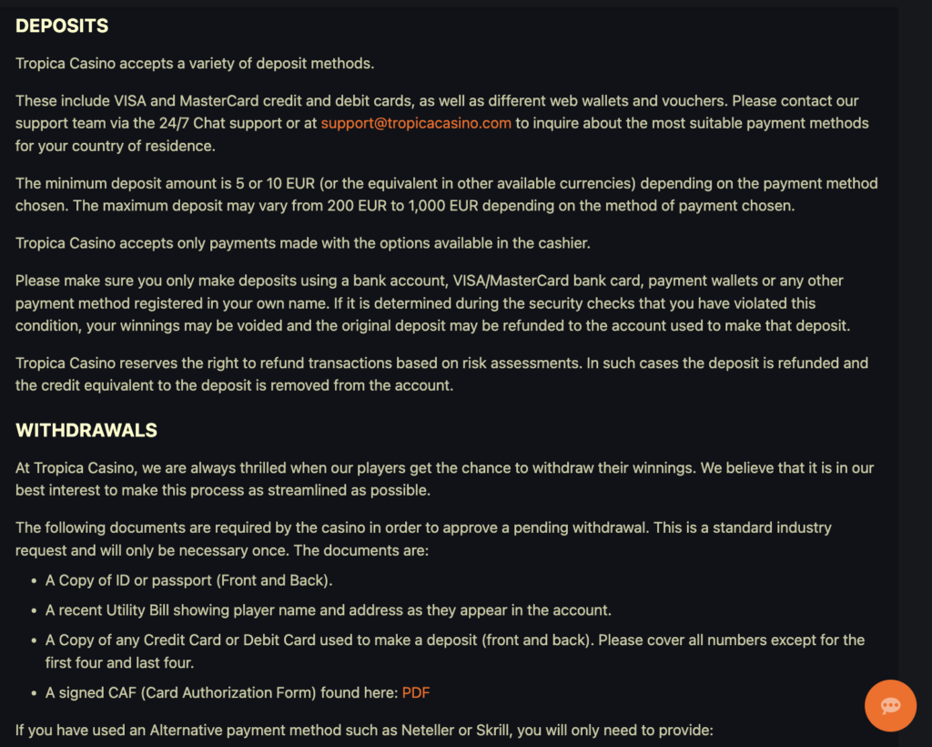 Tropica Casino accepts major credit cards like Visa and Mastercard. Bank transfers work too but take longer to process. Cryptocurrency is the fastest option – Bitcoin, Ethereum and Litecoin deposits appear instantly.